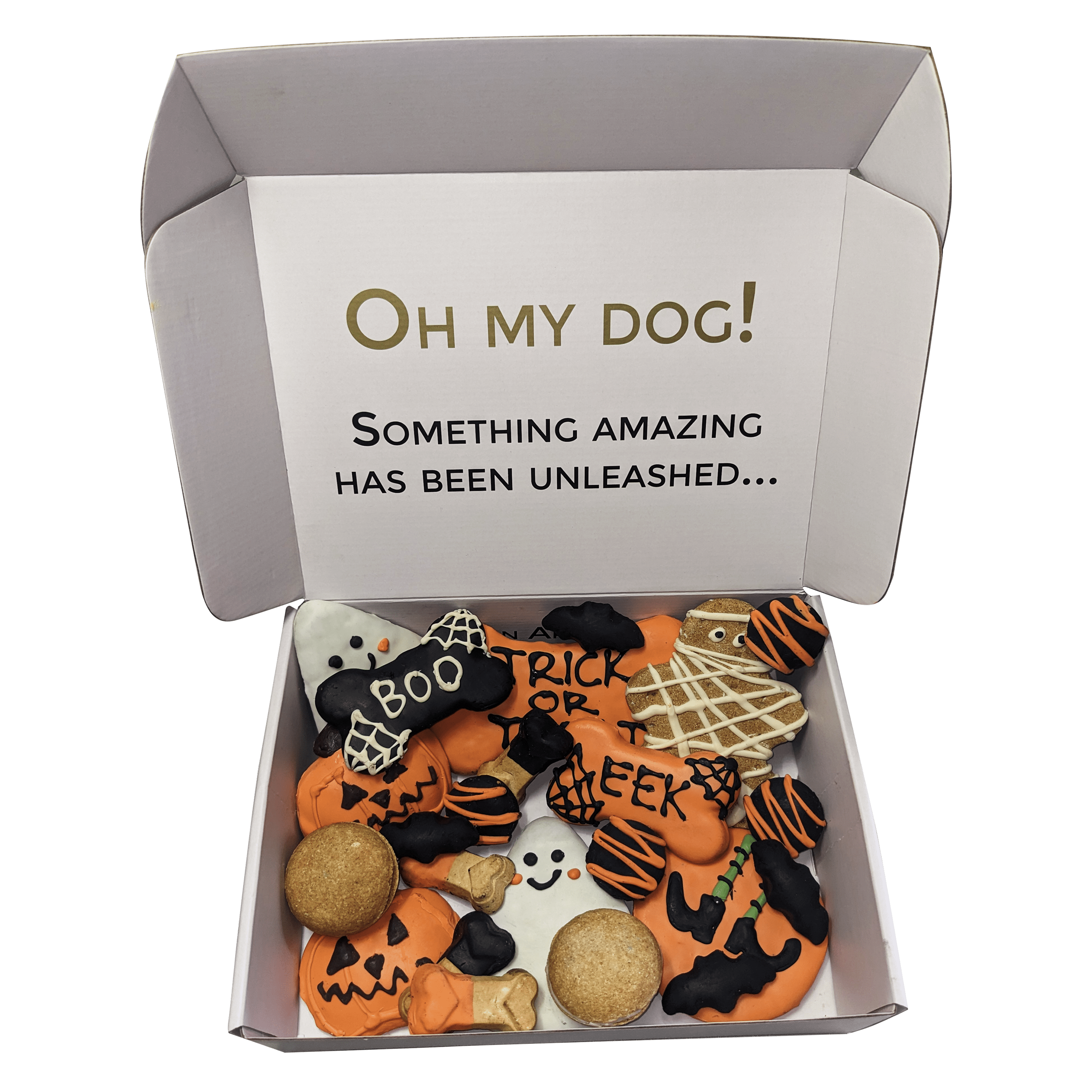 Includes 23 themed treats including happy ghost treats, spooky feet, dog bones, dog macarons, bats and so much more!
